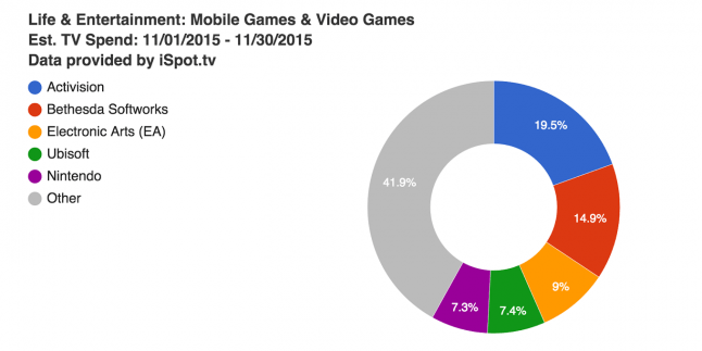 Skip forward to November, and mobile game makers are nowhere to be seen in iSpot.tv’s accounting of the month’s top 5 spenders; instead, it’s Activision (Call of Duty: Black Ops 3) leading at $18.6 million, followed by Bethesda (Fallout 4), Electronic Arts (Star Wars: Battlefront), Ubisoft (Tom Clancy’s Rainbow Six: Siege) and Nintendo (Pokemon Super Mystery Dungeon)
