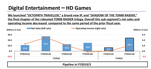 As the graph below shows, Square also witnessed a decline in HD game sales and revenue, despite the arrival of titles like Octopath Traveler and Shadow of the Tomb Raider.